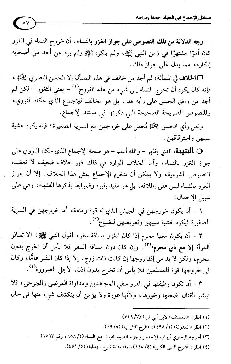 ولعل رأي الحسن -رحمه اللَّه- يُحمل على خروجهن مع السرية الصغيرة؛ فإنه يكره خشية سبيهن واسترقاقهن.Rالذي يظهر -واللَّه أعلم- هو صحة الإجماع الذي حكاه النووي على جواز الغزو بالنساء، وأما الخلاف الوارد في ذلك فهو خلاف ضعيف لا تعضده النصوص الشرعية، ولا يمكن أن ينخرم الإجماع بمثل هذا الخلاف. إلا أن جواز الغزو بالنساء ليس على إطلاقه، بل هو مقيد بقيود وضوابط يذكرها الفقهاء، وهي على سبيل الإجمال: