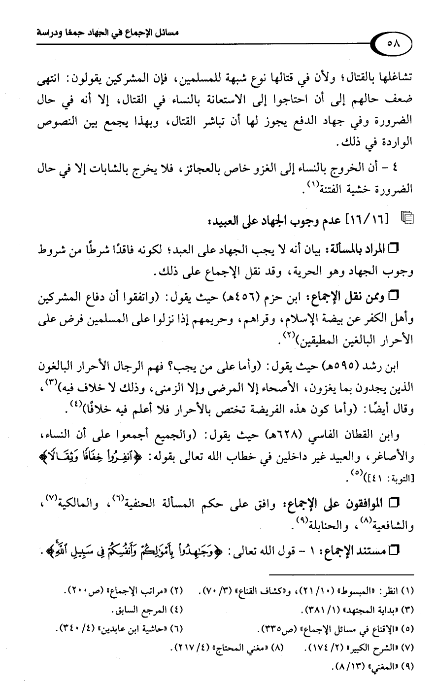 وابن القطان الفاسي (628 هـ) حيث يقول: (والجميع أجمعوا على أن النساء، والأصاغر، والعبيد غير داخلين فى خطاب اللَّه تعالى بقوله: {انْفِرُوا خِفَافًا وَثِقَالًا} [التوبة: 41] (¬5).
