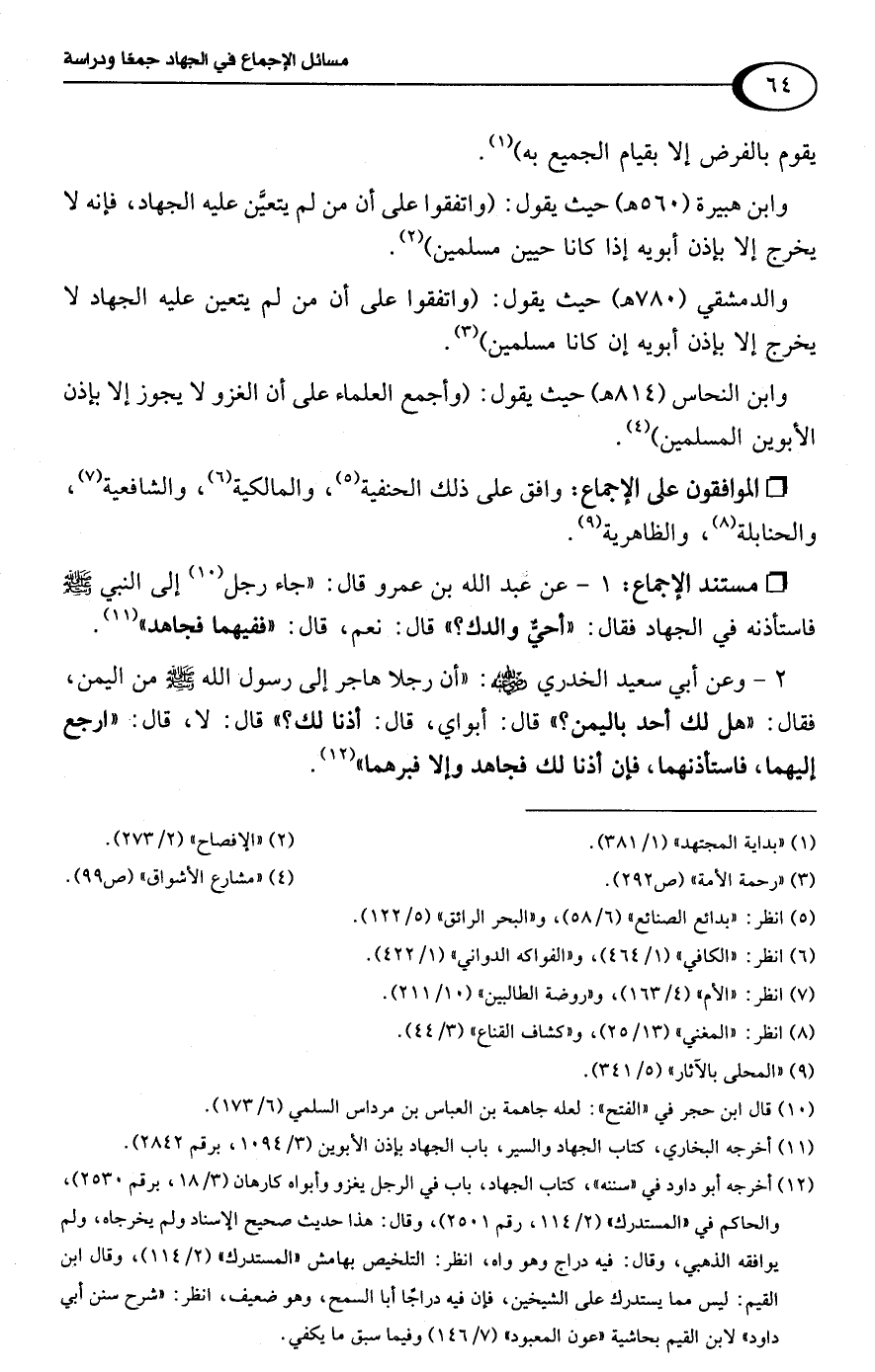 وابن هبيرة (560 هـ) حيث يقول: (واتفقوا على أن من لم يتعيَّن عليه الجهاد، فإنه لا يخرج إلا بإذن أبويه إذا كانا حيين مسلمين) (¬2).