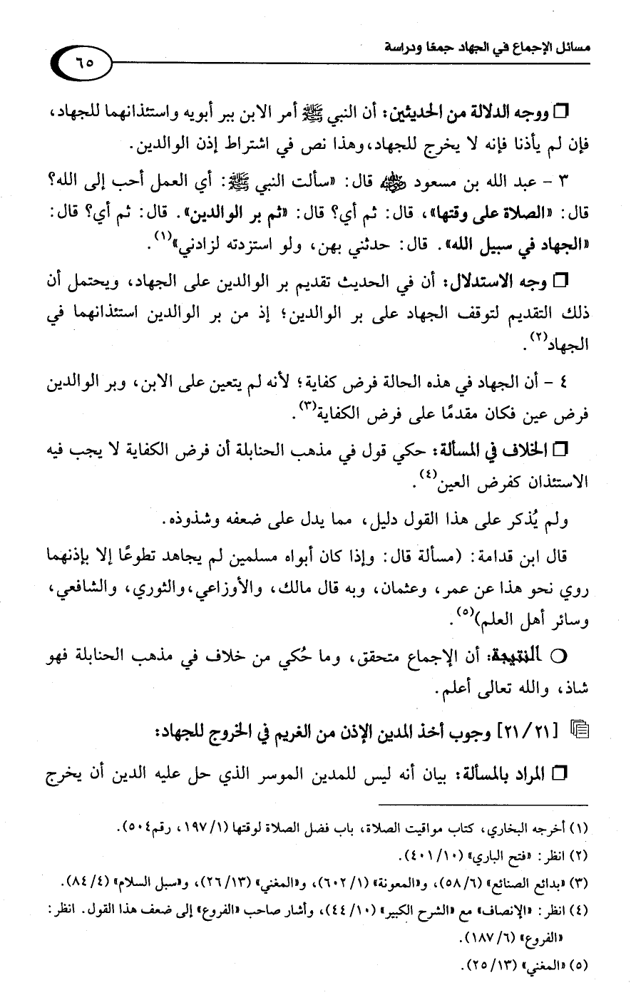 قال ابن قدامة: (مسألة قال: وإذا كان أبواه مسلمين لم يجاهد تطوعًا إلا بإذنهما روي نحو هذا عن عمر، وعثمان، وبه قال مالك، والأوزاعي، والثوري، والشافعي، وسائر أهل العلم) (¬5).Rأن الإجماع متحقق، وما حُكي من خلاف في مذهب الحنابلة فهو شاذ، واللَّه تعالى أعلم.