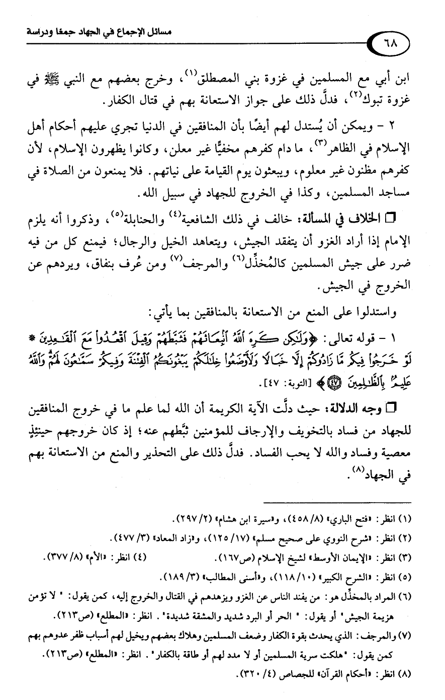 ابن أبي مع المسلمين في غزوة بني المصطلق (¬1)، وخرج بعضهم مع النبي -صلى اللَّه عليه وسلم- في غزوة تبوك (¬2)، فدلَّ ذلك على جواز الاستعانة بهم في قتال الكفار.