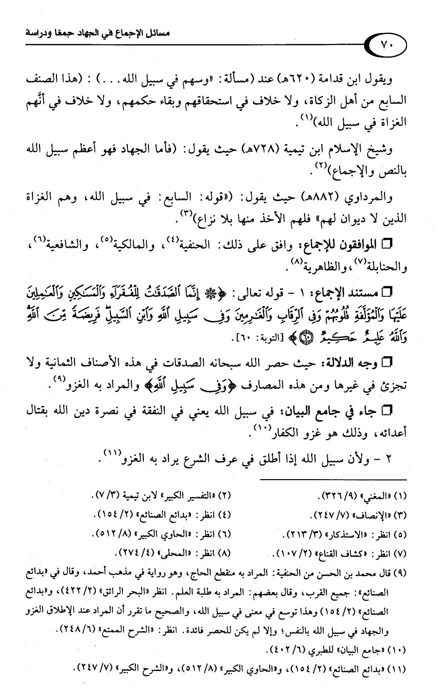 والمرداوي (882 هـ) حيث يقول: ("قوله: السابع: في سبيل اللَّه، وهم الغزاة الذين لا ديوان لهم" فلهم الأخذ منها بلا نزاع) (¬3).
