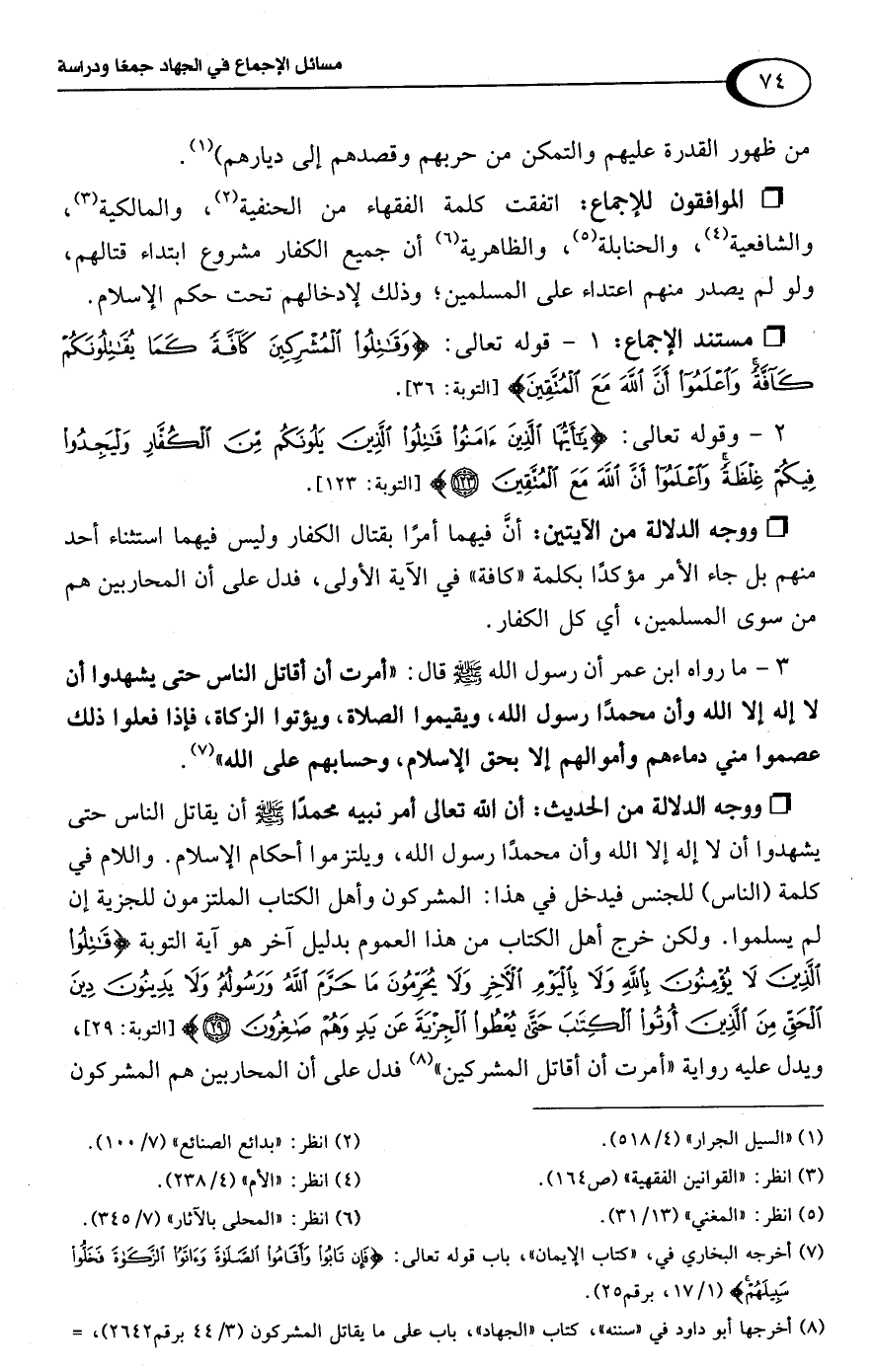 • الموافقون للإجماع: اتفقت كلمة الفقهاء من الحنفية (¬2)، والمالكية (¬3)، والشافعية (¬4)، والحنابلة (¬5)، والظاهرية (¬6) أن جميع الكفار مشروع ابتداء قتالهم، ولو لم يصدر منهم اعتداء على المسلمين؛ وذلك لإدخالهم تحت حكم الإسلام.