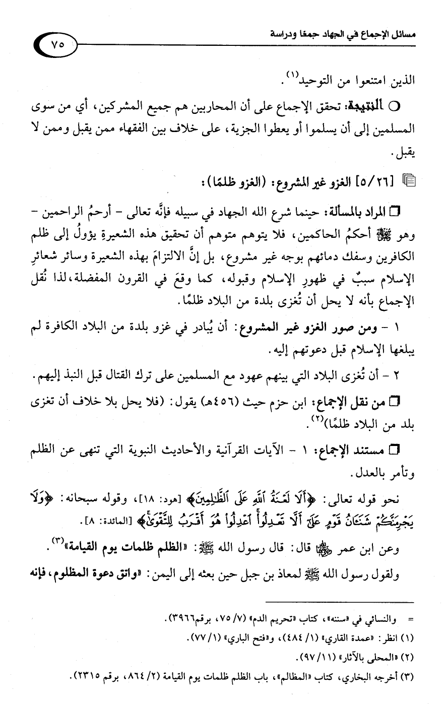 • من نقل الإجماع: ابن حزم حيث (456 هـ) يقول: (فلا يحل بلا خلاف أن تغزى بلد من البلاد ظلمًا) (¬2).