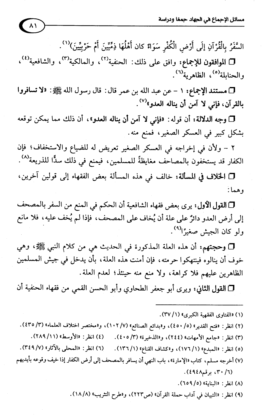 السَّفَرُ بِالْقُرْآنِ إلَى أَرْضِ الْكُفْرِ سَوَاءٌ كان أَهْلُها ذِمِّيِّينَ أَمْ حَرْبيِّينَ) (¬1).