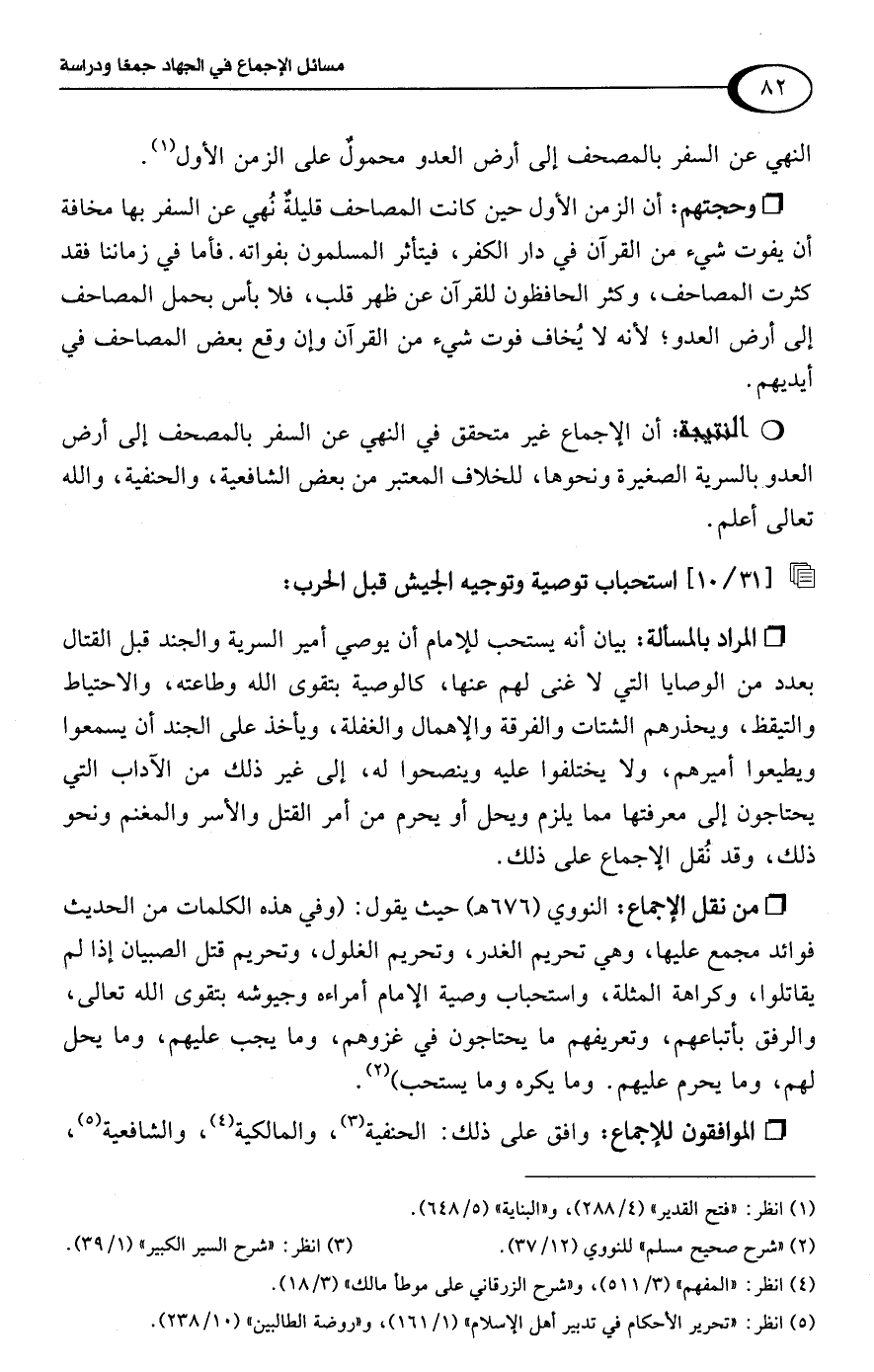 • من نقل الإجماع: النووي (676 هـ) حيث يقول: (وفي هذه الكلمات من الحديث فوائد مجمع عليها، وهي تحريم الغدر، وتحريم الغلول، وتحريم قتل الصبيان إذا لم يقاتلوا، وكراهة المثلة، واستحباب وصية الإمام أمراءه وجيوشه بتقوى اللَّه تعالى، والرفق بأتباعهم، وتعريفهم ما يحتاجون في غزوهم، وما يجب عليهم، وما يحل لهم، وما يحرم عليهم. وما يكره وما يستحب) (¬2).