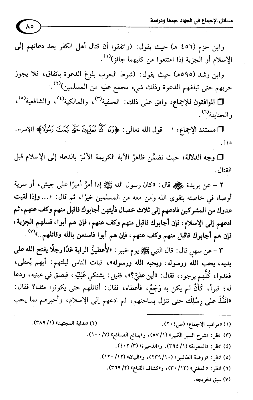 وابن حزم (456 هـ) حيث يقول: (واتفقوا أن قتال أهل الكفر بعد دعائهم إلى الإسلام أو الجزية إذا امتنعوا من كليهما جائز) (¬1).
