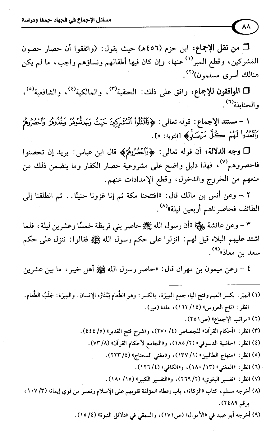 • من نقل الإجماع: ابن حزم (456 هـ) حيث يقول: (واتفقوا أن حصار حصون المشركين، وقطع المير (¬1) عنها، وإن كان فيها أطفالهم ونساؤهم واجب، ما لم يكن هنالك أسرى مسلمون) (¬2).