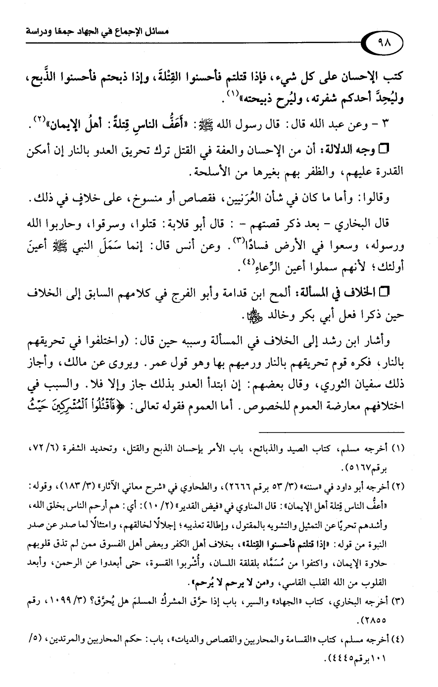 • وجه الدلالة: أن من الإحسان والعفة في القتل ترك تحريق العدو بالنار إن أمكن القدرة عليهم، والظفر بهم بغيرها من الأسلحة.