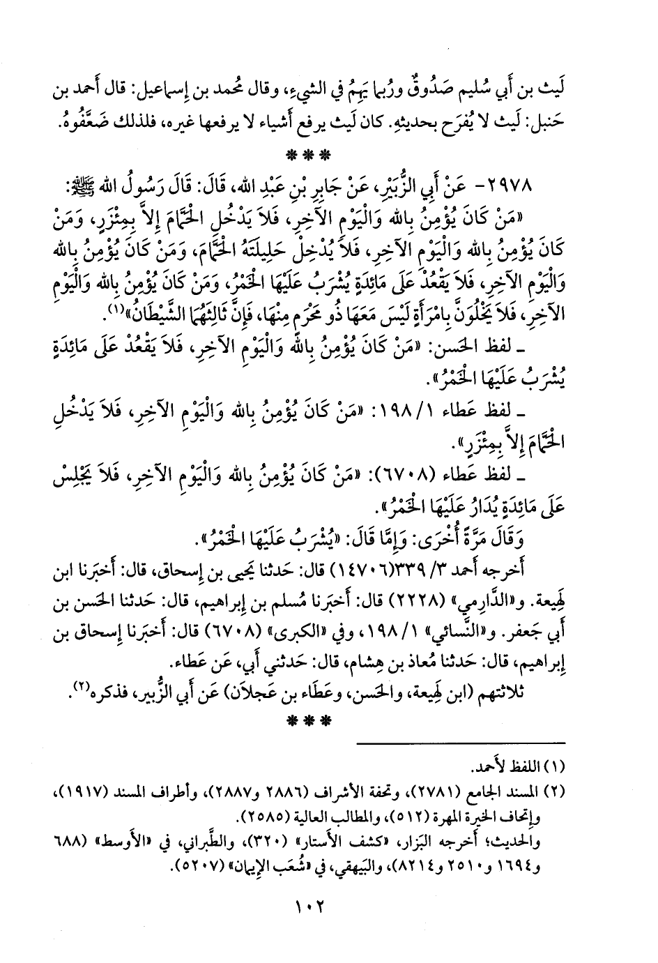 - لفظ عطاء ١/ ١٩٨: «من كان يؤمن بالله واليوم الآخر، فلا يدخل الحمام إلا بمئزر».