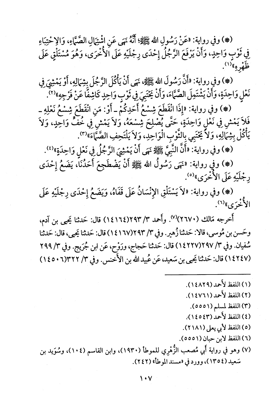 - وفي رواية: «إذا انقطع شسع أحدكم ـ أو: من انقطع شسع نعله ـ فلا يمش في نعل واحدة، حتى يصلح شسعه، ولا يمش في خف واحد، ولا يأكل بشماله، ولا يحتبي بالثوب الواحد، ولا يلتحف الصماء» (¬١).