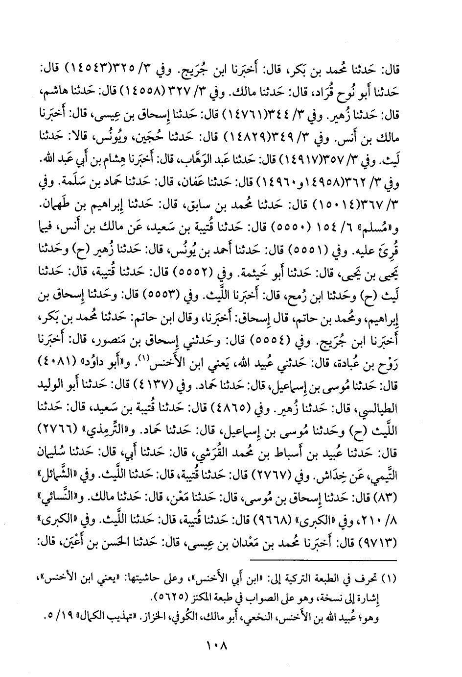 وفي ٣/ ٣٤٩ (١٤٨٢٩) قال: حدثنا حجين، ويونس، قالا: حدثنا ليث. وفي ٣/ ٣٥٧ (١٤٩١٧) قال: حدثنا عبد الوَهَّاب، قال: أخبرنا هشام بن أبي عبد الله. وفي ٣/ ٣٦٢ (١٤٩٥٨ و ١٤٩٦٠) قال: حدثنا عفان، قال: حدثنا حماد بن سلمة. وفي ٣/ ٣٦٧ (١٥٠١٤) قال: حدثنا محمد بن سابق، قال: حدثنا إبراهيم بن طهمان. و «مسلم» ٦/ ١٥٤ (٥٥٥٠) قال: حدثنا قتيبة بن سعيد، عن مالك بن أنس، فيما قرئ عليه. وفي (٥٥٥١) قال: حدثنا أحمد بن يونس، قال: حدثنا زهير (ح) وحدثنا يحيى بن يحيى، قال: حدثنا أَبو خيثمة. وفي (٥٥٥٢) قال: حدثنا قتيبة، قال: حدثنا ليث (ح) وحدثنا ابن رمح، قال: أخبرنا الليث. وفي (٥٥٥٣) قال: وحدثنا إسحاق بن إبراهيم، ومحمد بن حاتم، قال إسحاق: أخبرنا، وقال ابن حاتم: حدثنا محمد بن بكر، قال: أخبرنا ابن جُريج. وفي (٥٥٥٤) قال: وحدثني إسحاق بن منصور، قال: أخبرنا روح بن عبادة، قال: حدثني عُبيد الله، يعني ابن الأخنس (¬١). و «أَبو داود» (٤٠٨١) قال: حدثنا موسى بن إسماعيل، قال: حدثنا حماد. وفي (٤١٣٧) قال: حدثنا أَبو الوليد الطيالسي، قال: حدثنا زهير. وفي (٤٨٦٥) قال: حدثنا قتيبة بن سعيد، قال: حدثنا الليث (ح) وحدثنا موسى بن إسماعيل، قال: حدثنا حماد. و «التِّرمِذي» (٢٧٦٦) قال: حدثنا عبيد بن أسباط بن محمد القرشي، قال: حدثنا أبي، قال: حدثنا سليمان التيمي، عن خِداش. وفي (٢٧٦٧) قال: حدثنا قتيبة، قال: حدثنا الليث. وفي «الشمائل» (٨٣) قال: حدثنا إسحاق بن موسى، قال: حدثنا مَعْن، قال: حدثنا مالك. و «النَّسَائي» ٨/ ٢١٠، وفي «الكبرى» (٩٦٦٨) قال: حدثنا قتيبة، قال: حدثنا الليث. وفي «الكبرى» (٩٧١٣) قال: أخبرنا محمد بن معدان بن عيسى، قال: حدثنا الحسن بن أَعْيَن، قال: