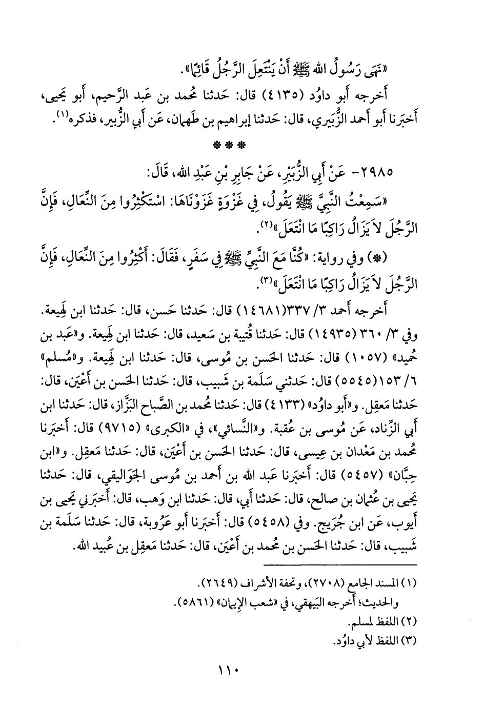- وفي رواية: «كنا مع النبي صَلى الله عَليه وسَلم في سفر، فقال: أكثروا من النعال، فإن الرجل لا يزال راكبا ما انتعل» (¬٢).