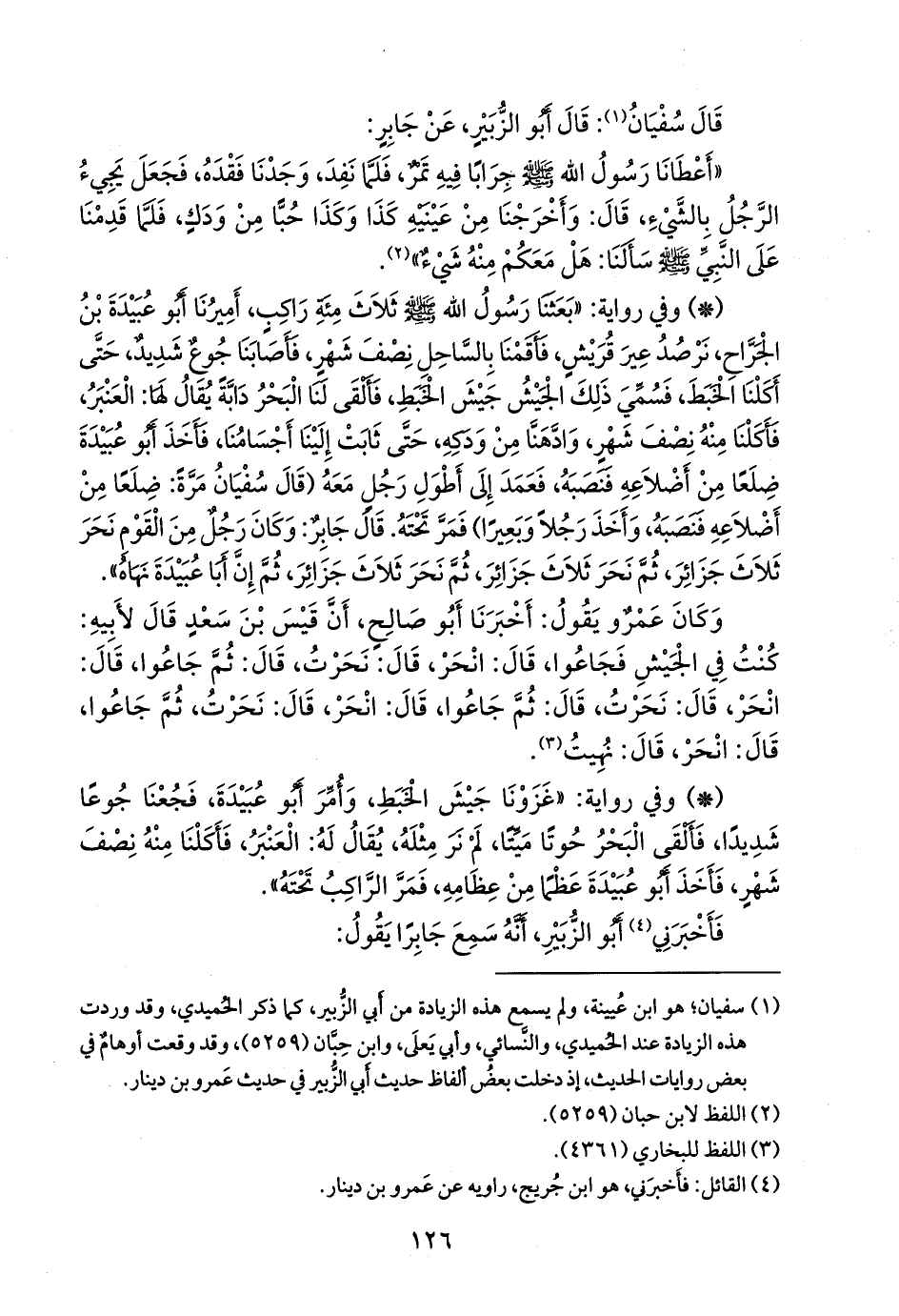 - وفي رواية: «بعثنا رسول الله صَلى الله عَليه وسَلم ثلاث مئة راكب، أميرنا أَبو عُبَيدة بن الجَراح، نرصد عير قريش، فأقمنا بالساحل نصف شهر، فأصابنا جوع شديد، حتى أكلنا الخبط، فسمي ذلك الجيش جيش الخبط، فألقى لنا البحر دابة يقال لها: العنبر، فأكلنا منه نصف شهر، وادهنا من ودكه، حتى ثابت إلينا أجسامنا، فأخذ أَبو عبيدة ضلعا من أضلاعه فنصبه، فعمد إلى أطول رجل معه (قال سفيان مرة: ضلعا من أضلاعه فنصبه، وأخذ رجلا وبعيرا) فمر تحته. قال جابر: وكان رجل من القوم نحر ثلاث جزائر، ثم نحر ثلاث جزائر، ثم نحر ثلاث جزائر، ثم إن أبا عبيدة نهاه».