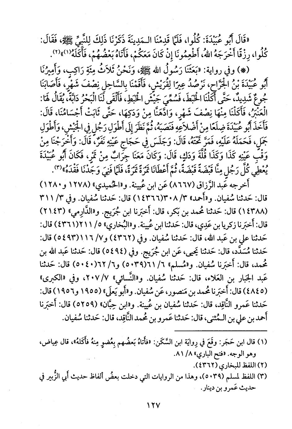 - وفي رواية: «بعثنا رسول الله صَلى الله عَليه وسَلم ونحن ثلاث مئة راكب، وأميرنا أَبو عُبَيدة بن الجَراح، نرصد عيرا لقريش، فأقمنا بالساحل نصف شهر، فأصابنا جوع شديد، حتى أكلنا الخبط، فسمي جيش الخبط، فألقى لنا البحر دابة، يقال لها: العنبر، فأكلنا منها نصف شهر، وادهنا من ودكها، حتى ثابت أجسامنا، قال: فأخذ أَبو عبيدة ضلعا من أضلاعه فنصبه، ثم نظر إلى أطول رجل في الجيش، وأطول جمل، فحمله عليه، فمر تحته، قال: وجلس في حجاج عينه نفر، قال: وأخرجنا من وقب عينه كذا وكذا قلة ودك، قال: وكان معنا جراب من تمر، فكان أَبو عبيدة يعطي كل رجل منا قبضة قبضة، ثم أعطانا تمرة تمرة، فلما فني وجدنا فقده» (¬١).