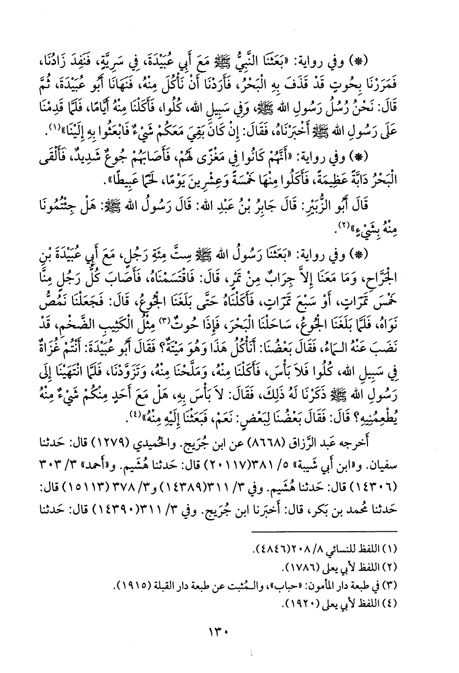 - وفي رواية: «بعثنا النبي صَلى الله عَليه وسَلم مع أبي عبيدة، في سرية، فنفد زادنا، فمررنا بحوت قد قذف به البحر، فأردنا أن نأكل منه، فنهانا أَبو عبيدة، ثم قال: نحن رسل رسول الله صَلى الله عَليه وسَلم وفي سبيل الله، كلوا، فأكلنا منه أياما، فلما قدمنا على رسول الله صَلى الله عَليه وسَلم أخبرناه، فقال: إن كان بقي معكم شيء فابعثوا به إلينا» (¬١).