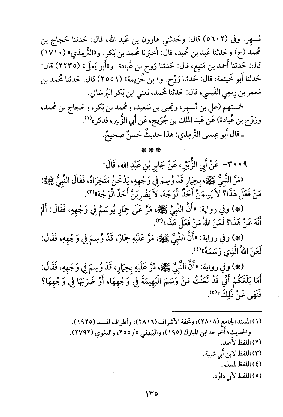 - وفي رواية: «عن النبي صَلى الله عَليه وسَلم؛ أنه مر عليه بحمار، قد كوي على وجهه، أو وسم، فلعن النبي صَلى الله عَليه وسَلم من فعل ذلك، ثم قال: سبحان الله، لا تضربوها على وجوهها» (¬٥).