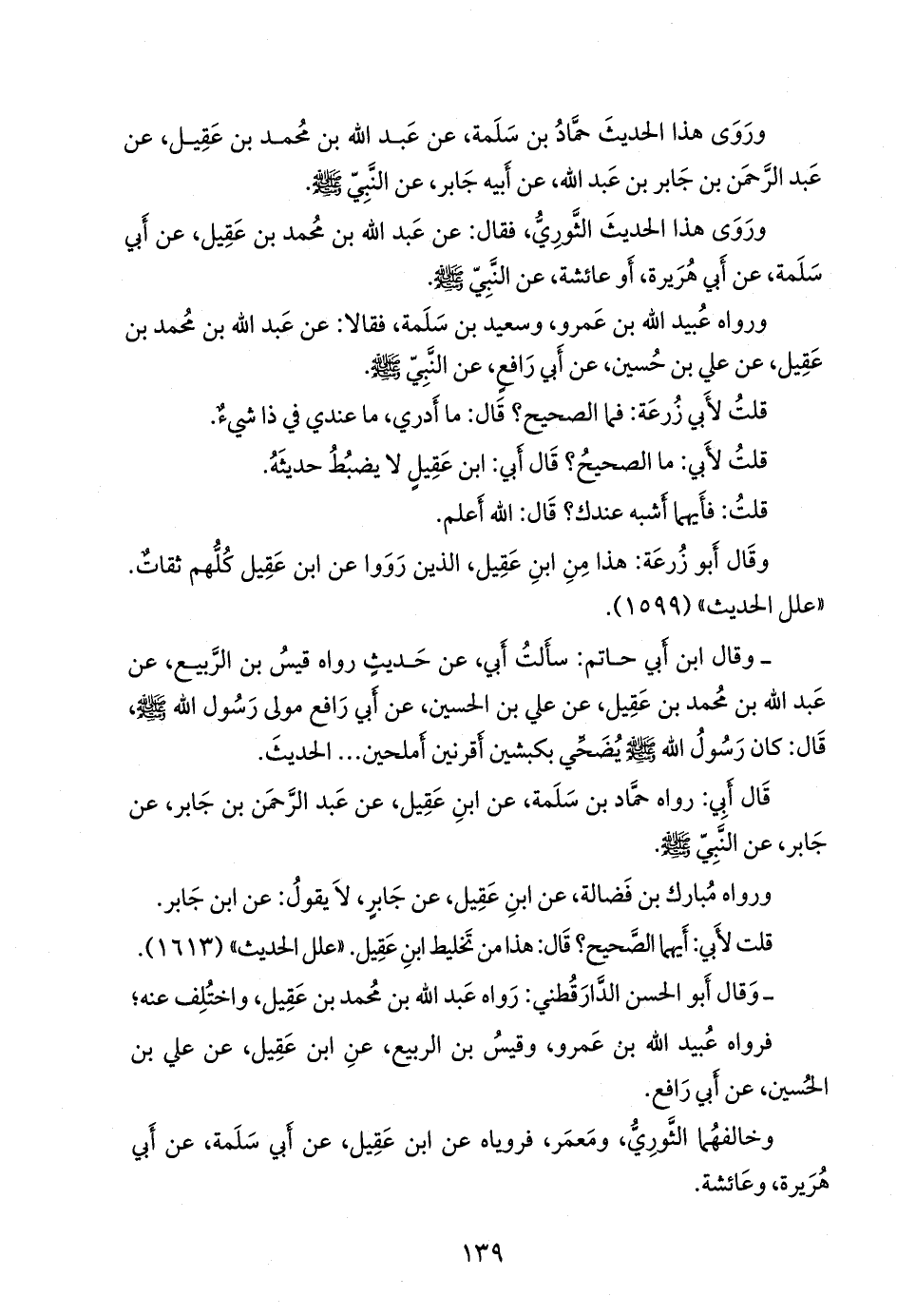 والاِضطِراب فيه من ابن عَقيل. «العلل» (١١٧٩ و ١٧٩٢) وهذا لفظ (١٧٩٢).
