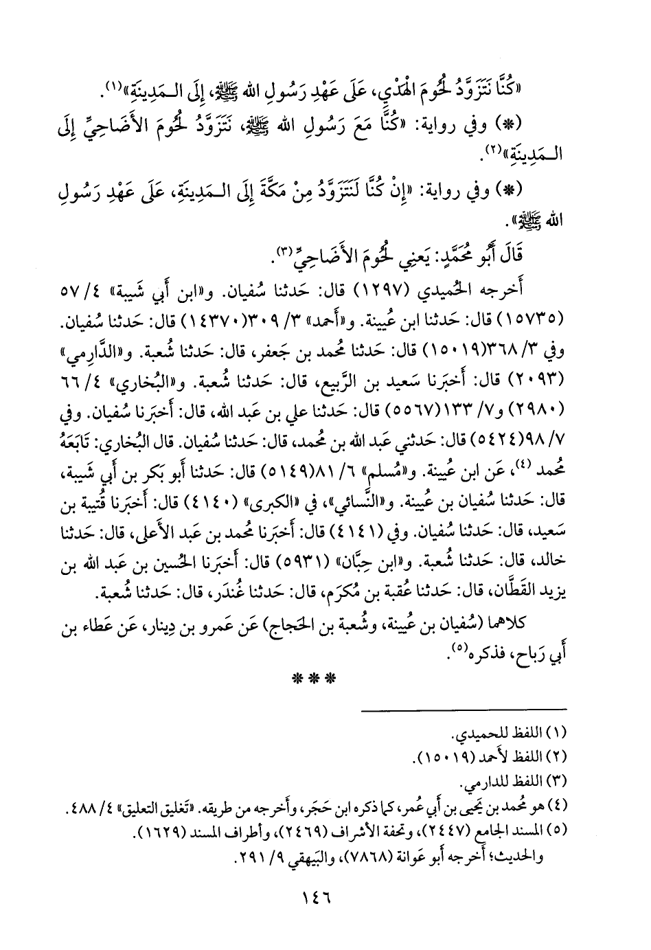 • أَخرجه ابن أَبي شيبة (١٥٧٣٠) قال: حدثنا علي بن مُسهِر، عن عبد الملك، عن عطاء، عن جابر بن عبد الله، قال: كنا نَبلغ المدينة بلحوم الأَضاحي.