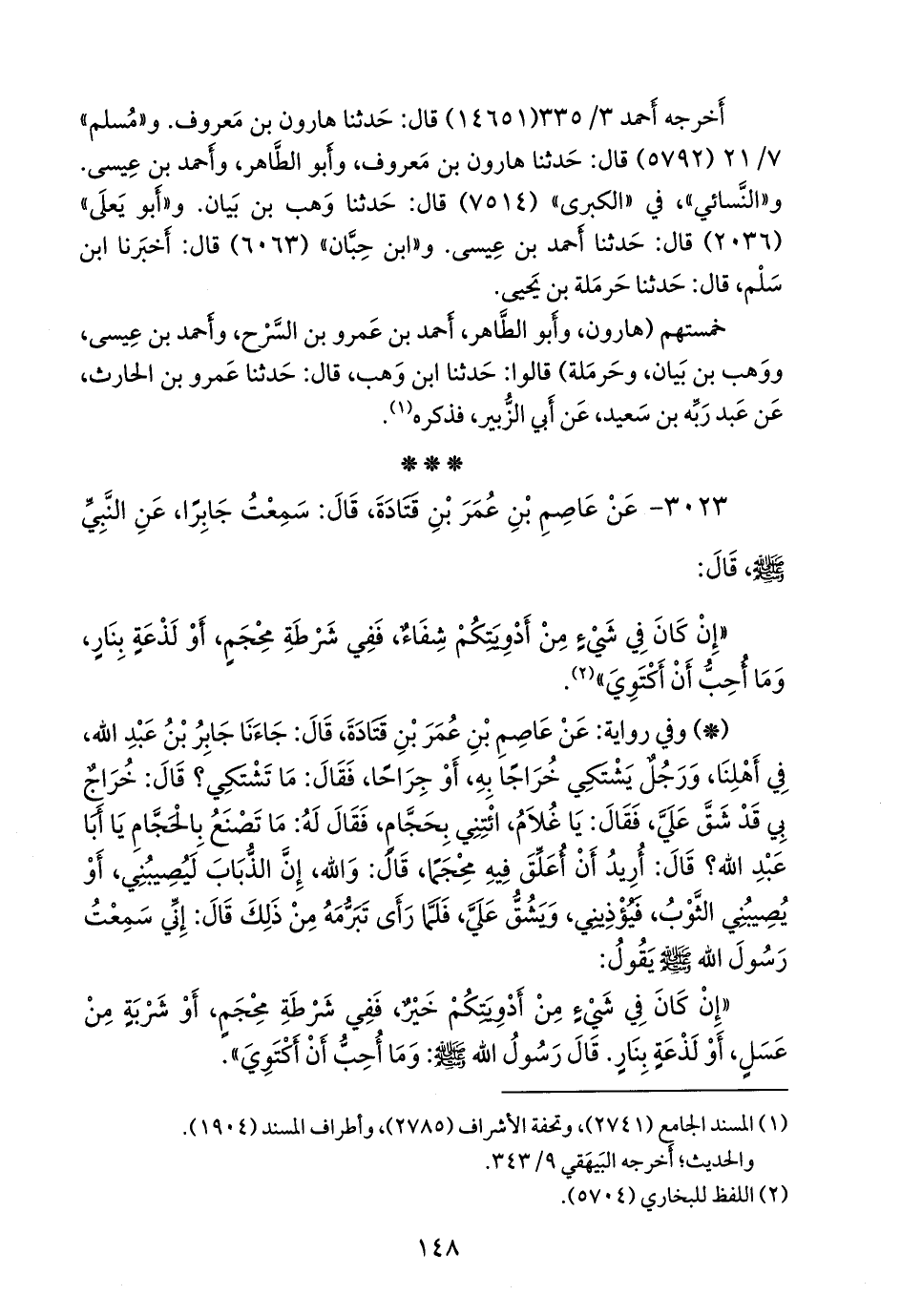 - وفي رواية: عن عاصم بن عمر بن قتادة، عن جابر، قال: جاء يعود المقنع بن سنان، وكان خال عاصم أخا أمه، فسلم عليه، وهو في رداء وإزار، وقد أصيب بصره، فقال: ماذا تشتكي؟ وقد مس رأسه ولحيته بشيء من صفرة، قال: خراج منعني النوم وأسهرني، قال جابر: يا غلام، ادع لنا حجاما، قال المقنع: وما تصنع بالحجام يا أبا عبد الله؟ قال: أريد أن أعلق فيه محجما، قال: غفر الله لك، والله إن الثوب ليصيبني، أو الذباب يقع علي يؤذيني، فلما رأى جزعه من ذلك، أنشأ يحدثنا عن رسول الله صَلى الله عَليه وسَلم قال: قال رسول الله صَلى الله عَليه وسَلم: