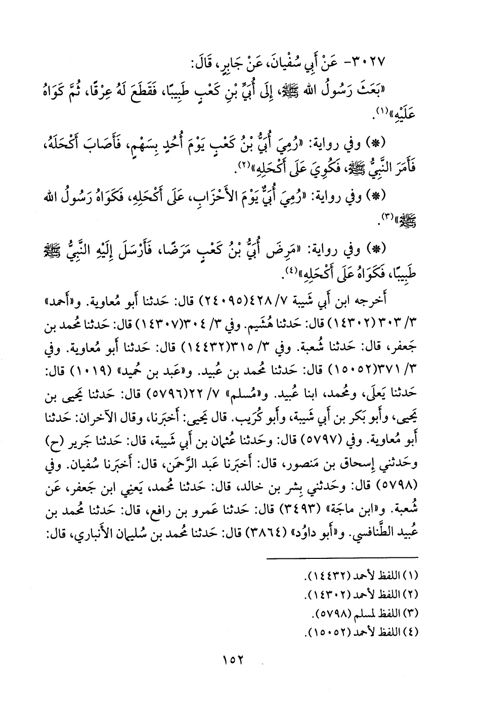 - وفي رواية: «مرض أُبي بن كعب مرضا، فأرسل إليه النبي صَلى الله عَليه وسَلم طبيبا، فكواه على أكحله» (¬٤).