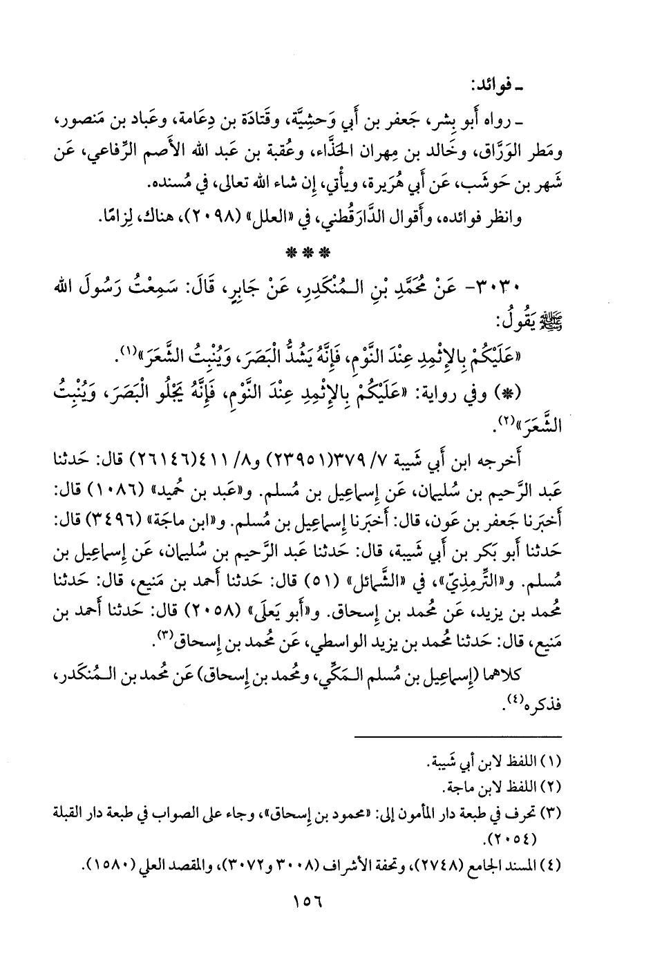 - وفي رواية: «عليكم بالإثمد عند النوم، فإنه يجلو البصر، وينبت الشعر» (¬٢).