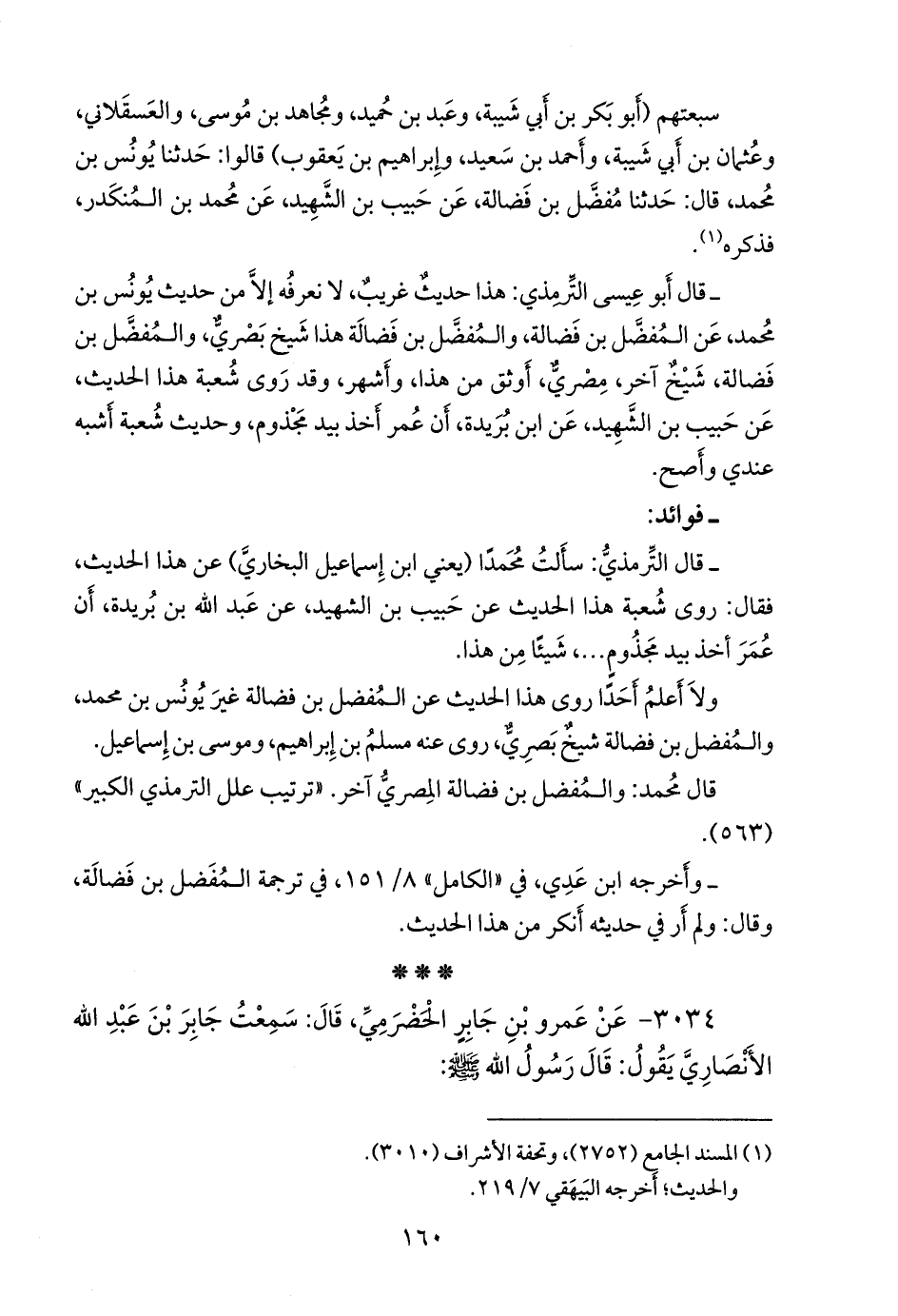 - قال التِّرمِذي: هذا حديثٌ غريبٌ، لا نعرفه إِلا من حديث يونس بن محمد، عن المُفَضل بن فَضالة.