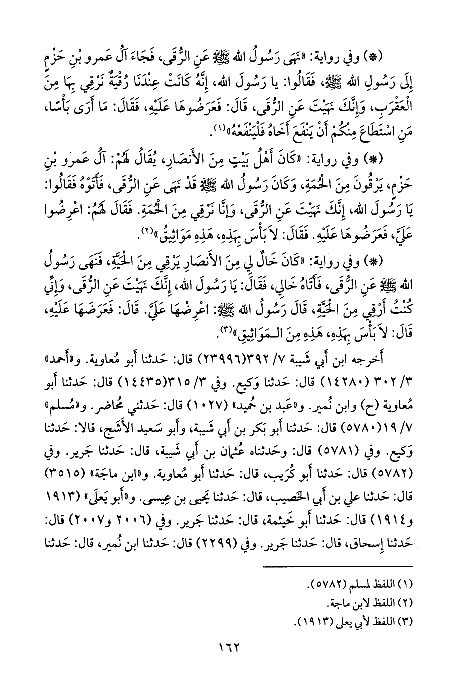 - وفي رواية: «كان خال لي من الأنصار يرقي من الحية، فنهى رسول الله صَلى الله عَليه وسَلم عن الرقى، فأتاه خالي، فقال: يا رسول الله، إنك نهيت عن الرقى، وإني كنت أرقي من الحية، قال رسول الله صَلى الله عَليه وسَلم: اعرضها علي. قال: فعرضها عليه، قال: لا بأس بهذه، هذه من المواثيق» (¬١).