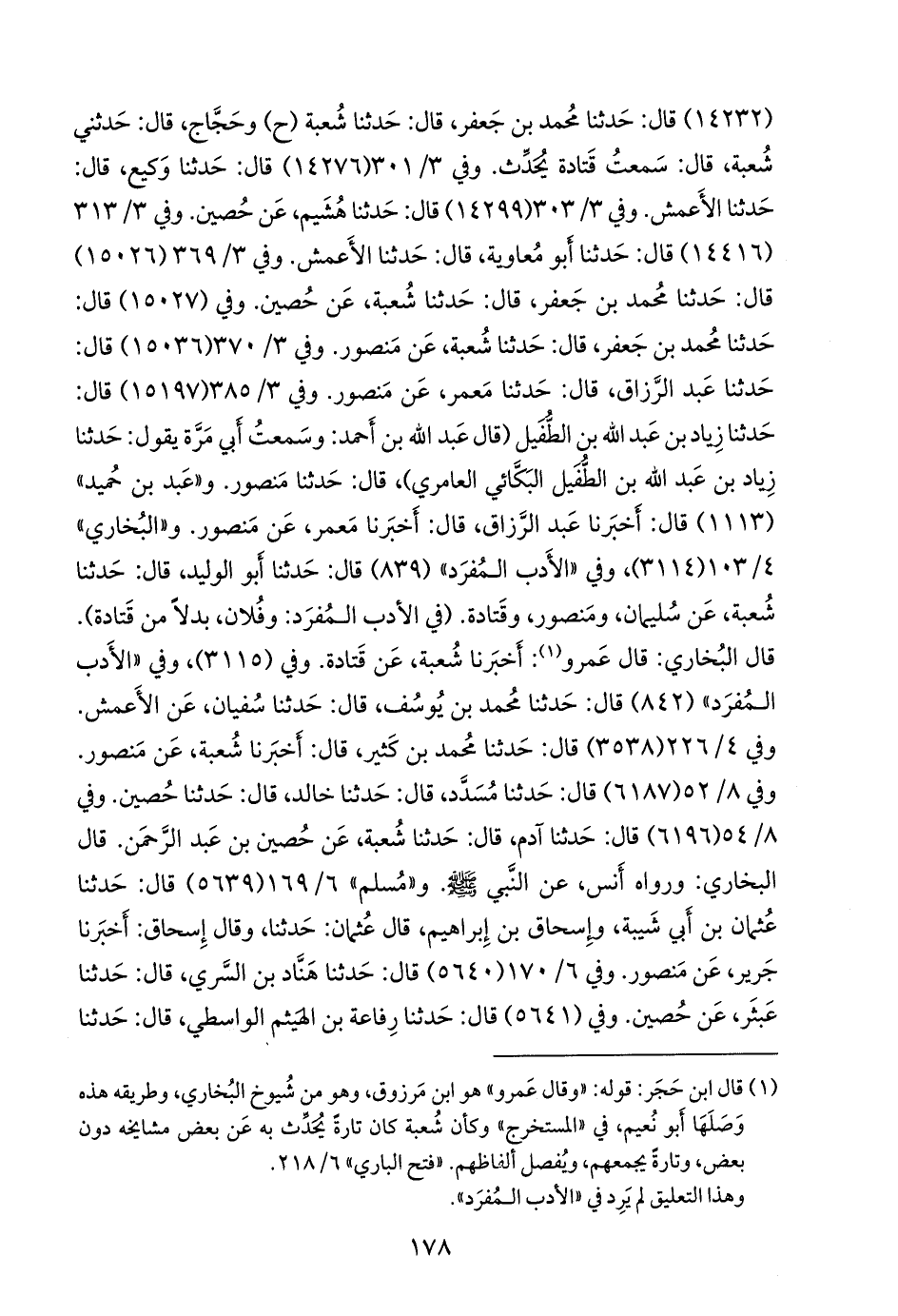 وكَأن شعبة كان تارةً يُحدِّث به عن بعض مشايخه دون بعض، وتارةً يَجمعهم ويَفصِلُ ألفاظهم. «فتح الباري» ٦/ ٢١٨.