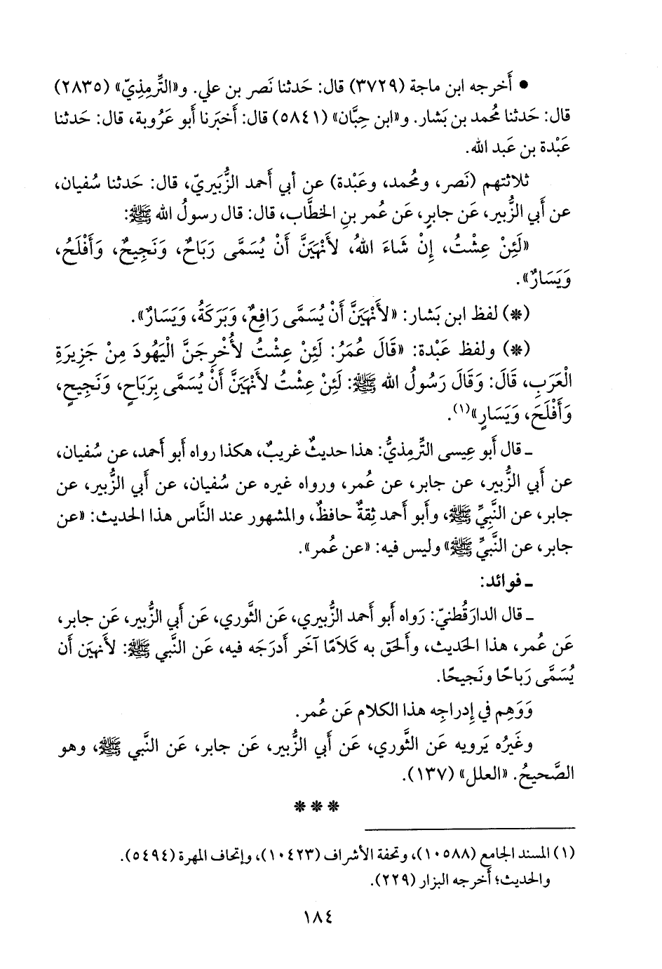 - قال الدارقُطني: رواه أَبو أحمد الزُّبَيري، عن الثوري، عن أبي الزبير، عن جابر، عن عمر، هذا الحديث، وألحق به كلاما آخر أدرجه فيه، عن النبي صَلى الله عَليه وسَلم: لأنهين أن يسمى رباحا ونجيحا.