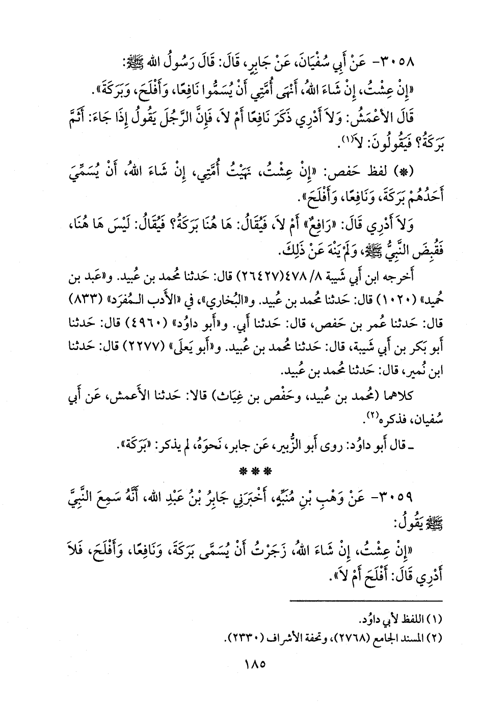 - لفظ حفص: «إن عشت، نهيت أمتي، إن شاء الله، أن يسمي أحدهم بركة، ونافعا، وأفلح».