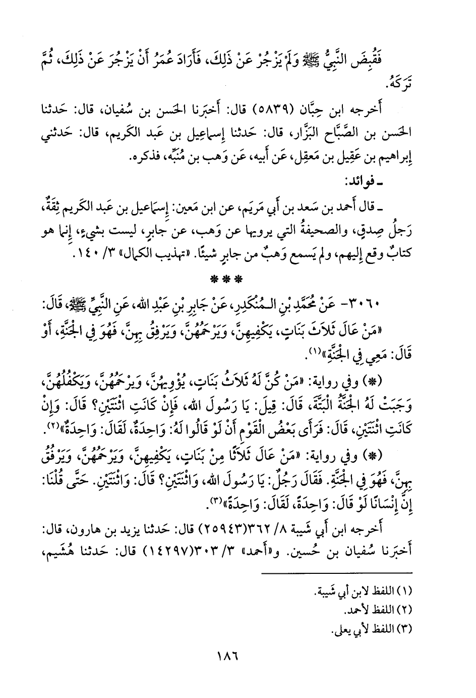 «من كن له ثلاث بنات، أو ثلاث أخوات، فكفلهن، وآواهن، ورحمهن، دخل الجنة، قالوا: أو اثنتين؟ قال: أو اثنتين، قالوا: حتى ظننا أنهم قالوا: أو واحدة؟»، «مُرسَل» (¬٢).