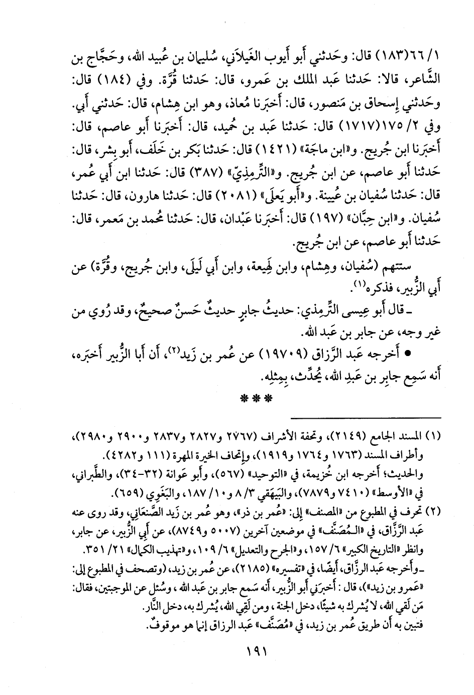 (¬٢) في طبعات المجلس العلمي والكتب العلمية والتأصيل: «عمر بن ذر»، وهو عمر بن زيد الصَّنْعاني، وقد روى عنه عبد الرزاق في «المُصَنَّف» في موضعين آخرين (٥٠٥٨ و ٨٩٢١)، عن أبي الزبير، وقد اشتبه هنا بـ «عمر بن ذَر الهمداني»، والذي يروي عنه عبد الرزاق أَيضًا، ولكن لم تُذكر له رواية عن أَبي الزبير.