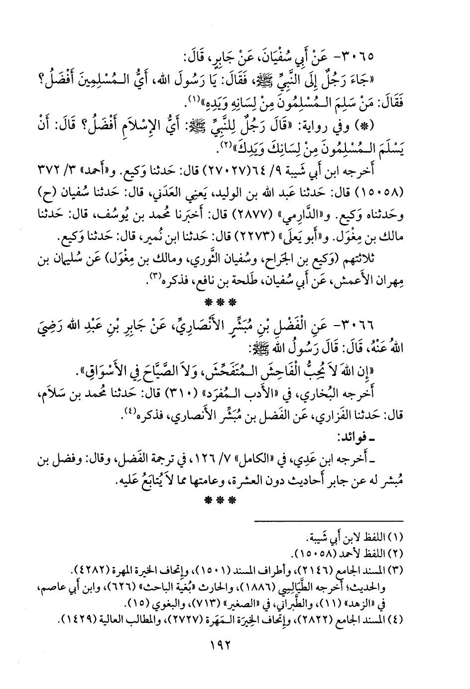 «جاء رجل إلى النبي صَلى الله عَليه وسَلم فقال: يا رسول الله، أي المسلمين أفضل؟ فقال: من سلم المسلمون من لسانه ويده» (¬١).