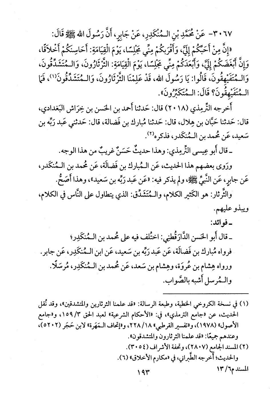 (¬١) في نسخة الكروخي الخطية، وطبعة الرسالة: «قد علمنا الثرثارين والمتشدقين»، وقد نقل الحديث، عن «جامع التِّرمِذي»، في: «الأحكام الشرعية» لعبد الحق ٣/ ١٥٩، و «جامع الأصول» (١٩٧٨)، و «تفسير القرطبي» ١٨/ ٢٢٨، و «إتحاف المهرة» لابن حجر (٥٢٠٢)، وعندهم جميعا: «قد علمنا الثرثارون والمتشدقون».