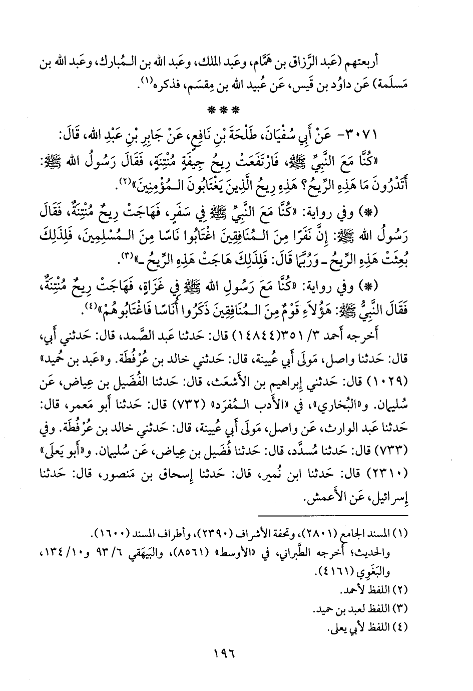 - وفي رواية: «كنا مع رسول الله صَلى الله عَليه وسَلم في غزاة، فهاجت ريح منتنة، فقال النبي صَلى الله عَليه وسَلم: هؤلاء قوم من المنافقين ذكروا أناسا فاغتابوهم» (¬٣).