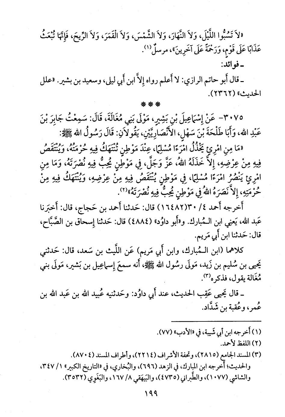 ٣٠٧٥ - عن إسماعيل بن بشير مولى بني مَغالة، قال: سمعت جابر بن عبد الله، وأبا طلحة بن سهل، الأَنصاريين، يقولان: قال رسول الله صَلى الله عَليه وسَلم: