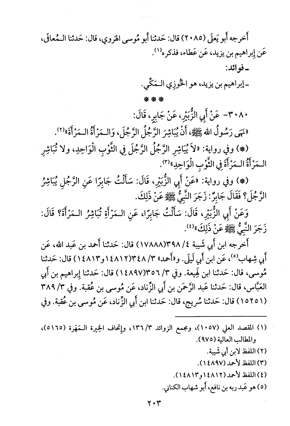 - وفي رواية: «عن أبي الزبير، قال: سألت جابرا عن الرجل يباشر الرجل؟ فقال جابر: زجر النبي صَلى الله عَليه وسَلم عن ذلك.