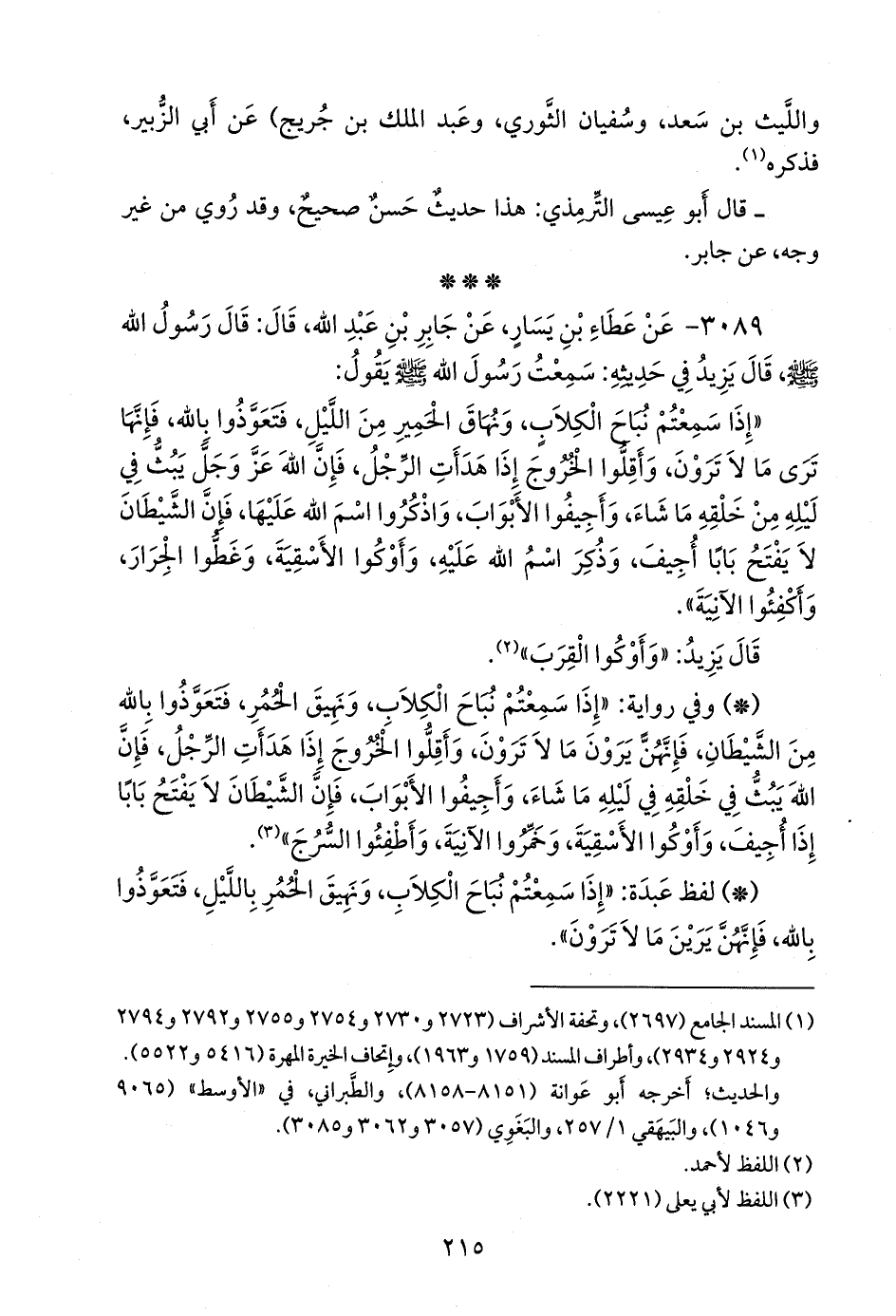 «إذا سمعتم نباح الكلاب، ونهاق الحمير من الليل، فتعوذوا بالله، فإنها ترى ما لا ترون، وأقلوا الخروج إذا هدأت الرجل، فإن الله عز وجل يبث في ليله من خلقه ما شاء، وأجيفوا الأَبواب، واذكروا اسم الله عليها، فإن الشيطان لا يفتح بابا أجيف، وذكر اسم الله عليه، وأوكوا الأسقية، وغطوا الجرار، وأكفئوا الآنية».