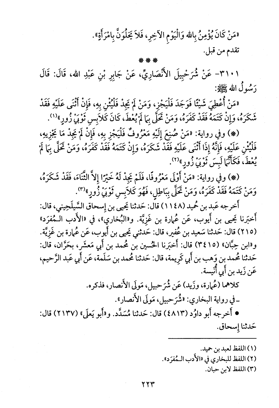 ٣١٠١ - عن شرحبيل الأَنصاري، عن جابر بن عبد الله، قال: قال رسول الله صَلى الله عَليه وسَلم:
