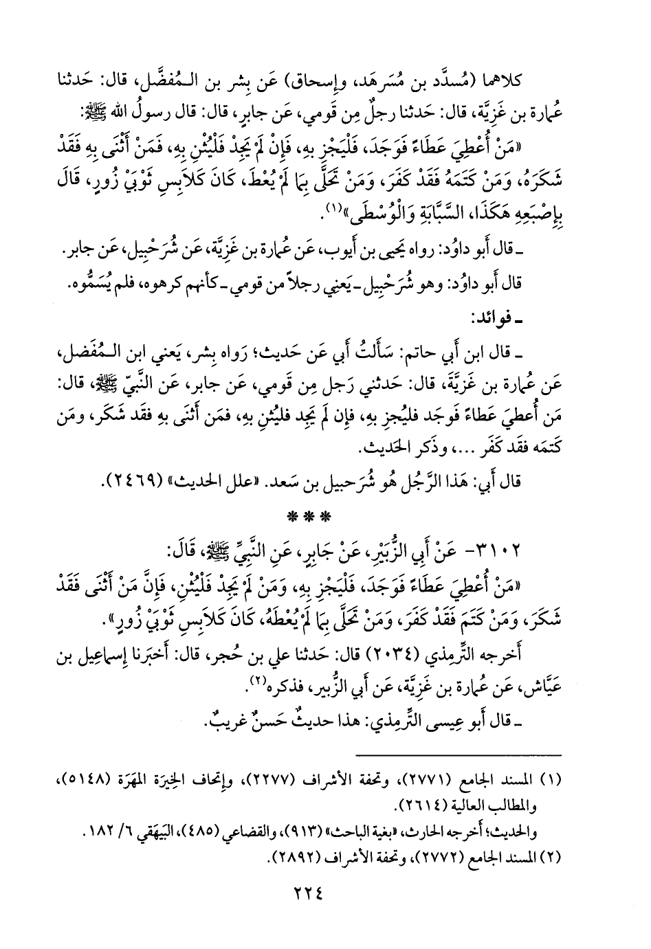- وقال ابن أبي حاتم: سألتُ أبي عن حديثٍ؛ رواه بشر، يعني ابن المُفَضَّل، عن عمارة بن غَزِيَّة، قال: حدثني رجل من قومي، عن جابر، عن النبي صَلى الله عَليه وسَلم قال: من أعطي عطاء فوجد فليجز به، فإن لم يجد فليثن به، فمن أثنى به فقد شكر، ومن كتمه فقد كفر ... ، وذكر الحديث.