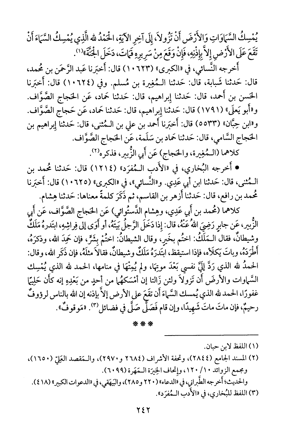 كلاهما (محمد بن أَبي عَدي، وهشام الدَّستوائي) عن الحجاج الصواف، عن أبي الزبير، عن جابر رضي الله عنه، قال: إذا دخل الرجل بيته، أو أوى إلى فراشه، ابتدره ملك وشيطان، فقال الملك: اختم بخير، وقال الشيطان: اختم بشر، فإن حمد الله، وذكره، أطرده، وبات يكلأه، فإذا استيقظ، ابتدره ملك وشيطان، فقالا مثله، فإن ذكر الله، وقال: الحمد لله الذي رد إلي نفسي بعد موتها، ولم يمتها في منامها، الحمد لله الذي يمسك السماوات والأرض أن تزولا ولئن زالتا إن أمسكهما من أحد من بعده إنه كأن حليما غفورا، الحمد لله الذي يمسك السماء أن تقع على الأرض إلا بإذنه إن الله بالناس لرؤوف رحيم، فإن مات مات شهيدا، وإن قام فصلى صلى في فضائل (¬٢). «موقوف».