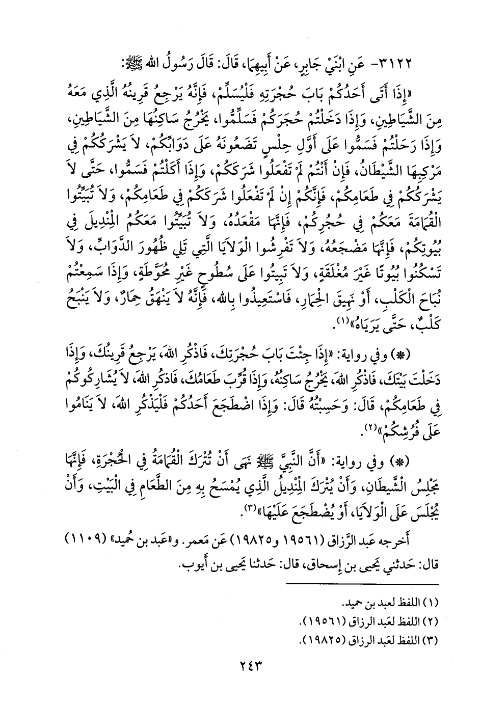 «إذا أتى أحدكم باب حجرته فليسلم، فإنه يرجع قرينه الذي معه من الشياطين، وإذا دخلتم حجركم فسلموا، يخرج ساكنها من الشياطين، وإذا رحلتم فسموا على أول حلس تضعونه على دوابكم، لا يشرككم في مركبها الشيطان، فإن أنتم لم تفعلوا شرككم، وإذا أكلتم فسموا، حتى لا يشرككم في طعامكم، فإنكم إن لم تفعلوا شرككم في طعامكم، ولا تبيتوا القمامة معكم في حجركم، فإنها مقعده، ولا تبيتوا معكم المنديل في بيوتكم، فإنها مضجعه، ولا تفرشوا الولايا التي تلي ظهور الدواب، ولا تسكنوا بيوتا غير مغلقة، ولا تبيتوا على سطوح غير محوطة، وإذا سمعتم نباح الكلب، أو نهيق الحمار، فاستعيذوا بالله، فإنه لا ينهق حمار، ولا ينبح كلب، حتى يرياه».