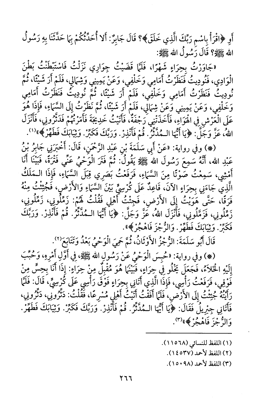 - وفي رواية: «عن أبي سلمة بن عبد الرَّحمَن، قال: أخبرني جابر بن عبد الله، أنه سمع رسول الله صَلى الله عَليه وسَلم يقول: ثم فتر الوحي عني فترة، فبينا أنا أمشي، سمعت صوتا من السماء، فرفعت بصري قبل السماء، فإذا الملك الذي جاءني بحراء الآن، قاعد على كرسي بين السماء والأرض، فجثثت منه فرقا، حتى هويت إلى الأرض، فجئت أهلي فقلت لهم: زملوني، زملوني، زملوني، فزملوني، فأنزل الله، عز وجل: {يا أيها المدثر. قم فأنذر. وربك فكبر. وثيابك فطهر. والرجز فاهجر}».