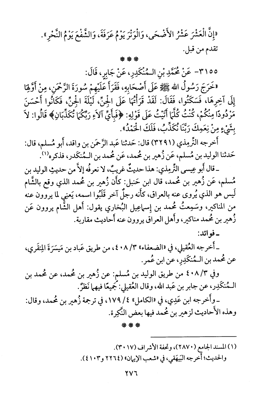 وفي ٣/ ٤٠٨ من طريق الوليد بن مسلم: عن زهير بن محمد، عن محمد بن المُنكدِر، عن جابر بن عبد الله، وقال العُقيلي: جميعا فيهما نظر.