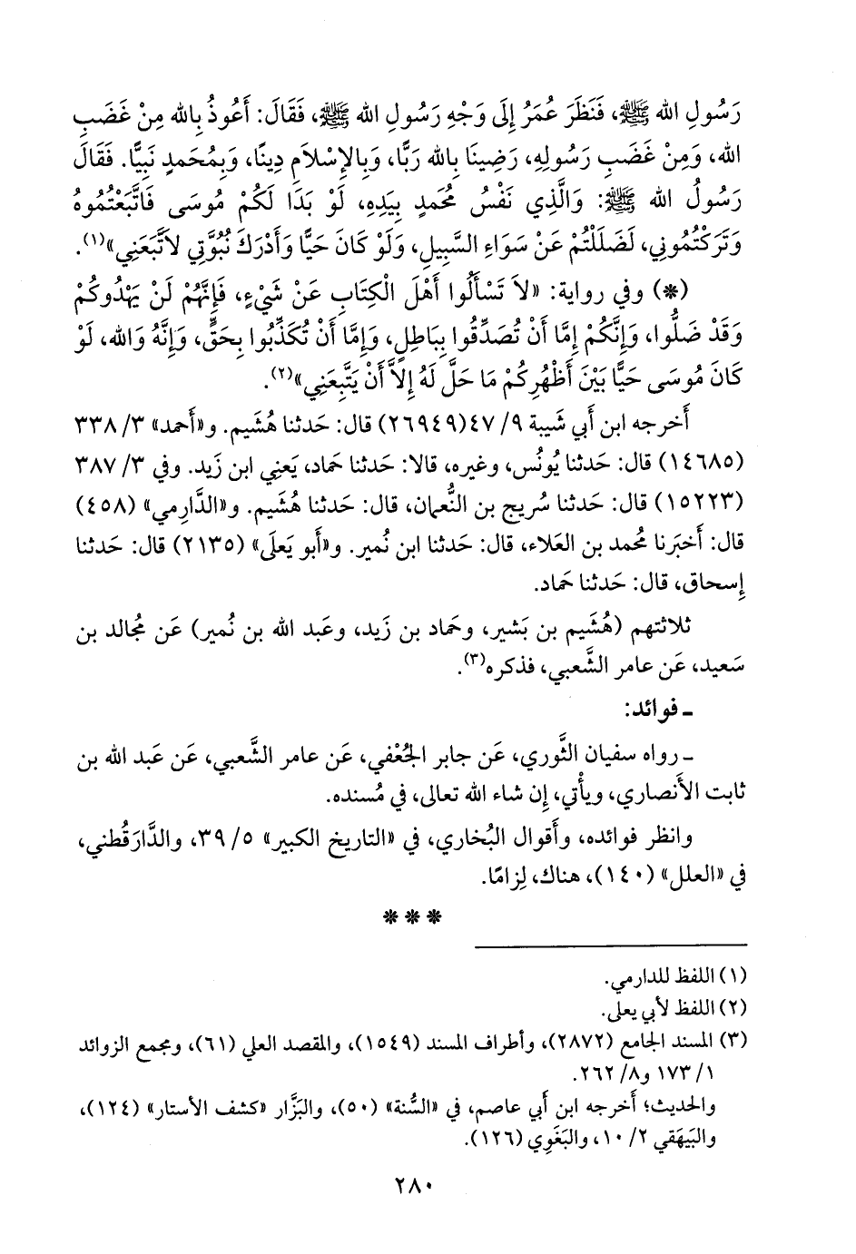 - وفي رواية: «لا تسألوا أهل الكتاب عن شيء، فإنهم لن يهدوكم وقد ضلوا، وإنكم إما أن تصدقوا بباطل، وإما أن تكذبوا بحق، وإنه والله، لو كان موسى حيا بين أظهركم ما حل له إلا أن يتبعني» (¬١).
