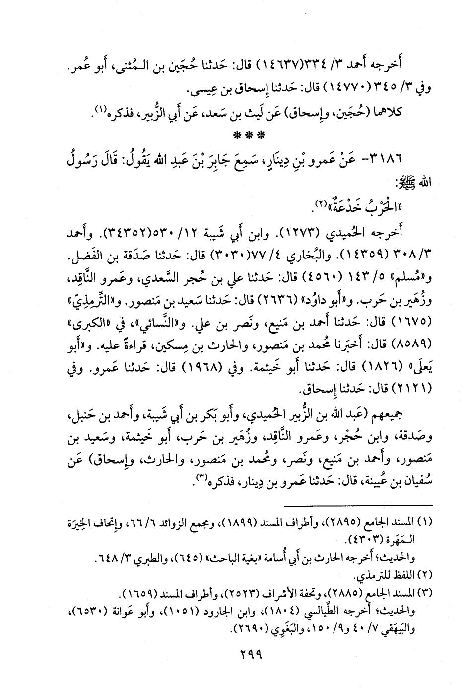 - وقال أَبو عثمان، عَمرو بن محمد الناقد، في روايته عند أبي يَعلى: قال لي بعض أصحابنا: كثير منهم كأن يقول: «الحرب خَدعة»، ولم أسمعه أنا إلا بالرفع: «خُدعة».