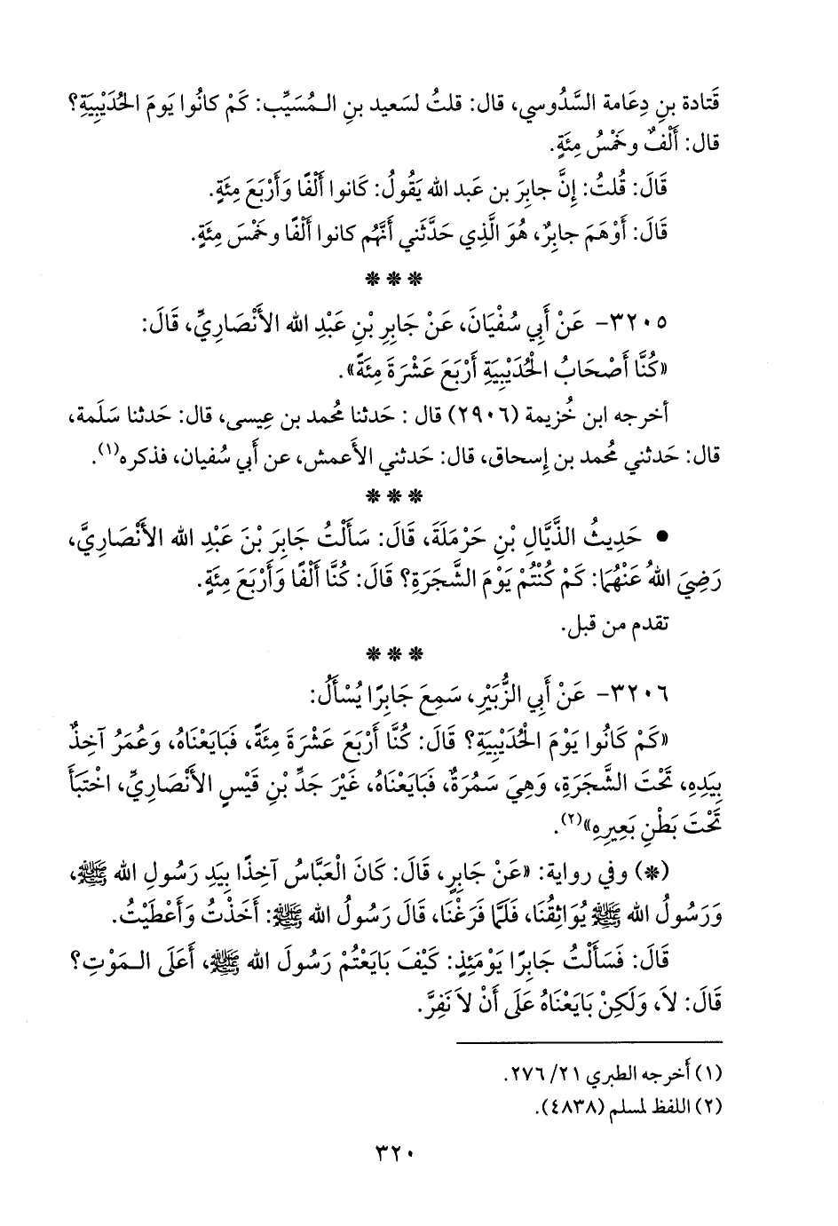 • حديث الذيال بن حَرملة، قال: سألت جابر بن عبد الله الأَنصاري، رضي الله عنهما: كم كنتم يوم الشجرة؟ قال: كنا ألفا وأربع مئة.
