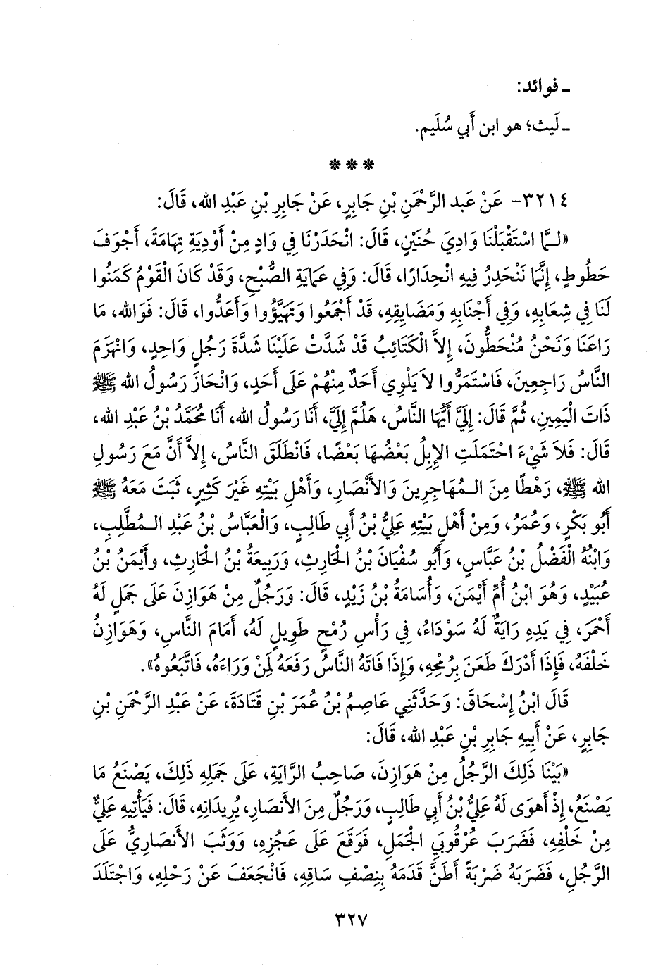 «لما استقبلنا وادي حنين، قال: انحدرنا في واد من أودية تهامة، أجوف حطوط، إنما ننحدر فيه انحدارا، قال: وفي عماية الصبح، وقد كان القوم كمنوا لنا في شعابه، وفي أجنابه ومضايقه، قد أجمعوا وتهيؤوا وأعدوا، قال: فوالله، ما راعنا ونحن منحطون، إلا الكتائب قد شدت علينا شدة رجل واحد، وانهزم الناس راجعين، فاستمروا لا يلوي أحد منهم على أحد، وانحاز رسول الله صَلى الله عَليه وسَلم ذات اليمين، ثم قال: إلي أيها الناس، هلم إلي، أنا رسول الله، أنا محمد بن عبد الله، قال: فلا شيء احتملت الإبل بعضها بعضا، فانطلق الناس، إلا أن مع رسول الله صَلى الله عَليه وسَلم رهطا من المهاجرين والأنصار، وأهل بيته غير كثير، ثبت معه صَلى الله عَليه وسَلم أَبو بكر، وعمر، ومن أهل بيته علي بن أبي طالب، والعباس بن عبد المطلب، وابنه الفضل بن عباس، وأَبو سفيان بن الحارث، وربيعة بن الحارث، وأيمن بن عبيد، وهو ابن أم أيمن، وأُسامة بن زيد، قال: ورجل من هوازن على جمل له أحمر، في يده راية له سوداء، في رأس رمح طويل له، أمام الناس، وهوازن خلفه، فإذا أدرك طعن برمحه، وإذا فاته الناس رفعه لمن وراءه، فاتبعوه».