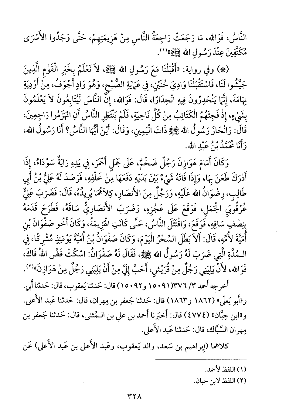 - وفي رواية: «أقبلنا مع رسول الله صَلى الله عَليه وسَلم لا نعلم بخبر القوم الذين جيشوا لنا، فاستقبلنا وادي حنين، في عماية الصبح، وهو واد أجوف، من أودية تهامة، إنما ينحدرون فيه انحدارا، قال: فوالله، إن الناس ليتابعون لا يعلمون بشيء، إذ فجئهم الكتائب من كل ناحية، فلم ينتظر الناس أن انهزموا راجعين، قال: وانحاز رسول الله صَلى الله عَليه وسَلم ذات اليمين، وقال: أين أيها الناس؟ أنا رسول الله، وأنا محمد بن عبد الله.